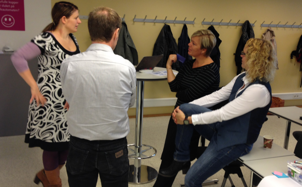 Deretter er det bare å sette i gang og snakke sammen, for å finne folk å samarbeide med (vi vil helst at folk jobber i grupper på to eller tre.) Vi ser fort at folk finner likesinnede med prosjekter eller interesseområder som ligger tett opp til sine egne. Noen få studenter har intet prosjekt de ønsker å gjøre, men vil i stedet fortelle litt om seg selv og hva slags gruppe de kunne tenke seg å jobbe med senere. De neste timene går til livlige diskusjoner: