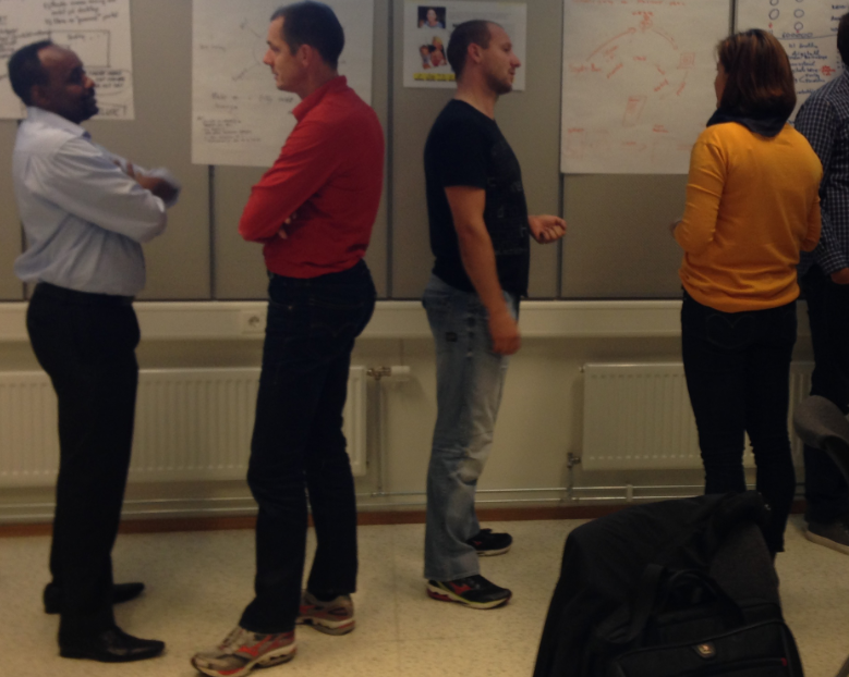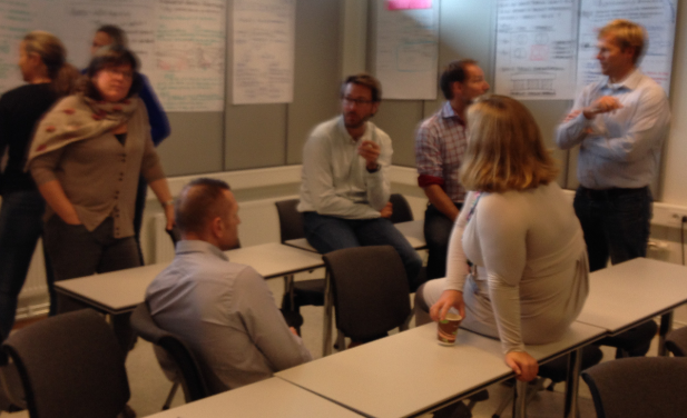 Jeg er nettopp ferdig med en svært morsom dag – nemlig lørdagen på første samling på kurset i Strategisk forretningsutvikling og innovasjon. I dette kurset tar vi studentene gjennom et prosjekt der de utvikler en idé – en organisasjonsendring, et nytt produkt eller en ny tjeneste, et nytt system, hva som helst. Vi starter med en idemyldring, som foregår på denne måten: Hver student får et A2-ark og tusjer, og må lage en plakat som illustrerer idéen deres. Deretter får de to minutter (og ikke et sekund lenger) til å presentere idéen sin. Det eneste kravet Ragnvald og jeg setter, er at idéen skal være reell – det skal være et faktisk prosjekt man vil gjøre – og at den skal være konkret (ingen generelle utredningsoppgaver.) Etter at man er ferdig med presentasjonene, forsøker Ragnvald og jeg å gruppere plakatene rundt omkring i klasserommet. Så stiller hver student seg foran sin plakat, så alle kan notere seg hvor de personene man ønsker å snakke med står – her, for eksempel, er alle de som skal skrive en avsluttende oppgave i Master of Management-programmet: