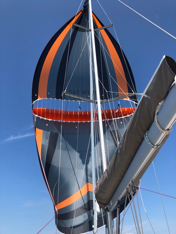 Svak vind (6-8 sekundmeter) rett bakfra sammen med bølger er nokså kronglete. Som regel løser man det ved å bruke enten genoa eller storseil helt over (og hvis vinden er absolutt riktig, genoa den ene veien og storseilet den andre). Gennaker/spinnaker er også en mulighet, men krever stabil vind og ikke alt for mye bølger. Dette seilet er spesiallaget for denne situasjonen, og har et fallskjermaktig system i midten som holder det utspilt. Og det gikk fort – 8.4 knop på 8 sekundmeter vind, og seilet var nokså robust overfor rullende bølger. Masse justeringsmuligheter og gode muligheter for dumme seg ut (sjølivet tilbyr dette i overflod), men du verden så morsomt når det endelig stod der det skulle og vi nærmest fløy over bølgeryggene!