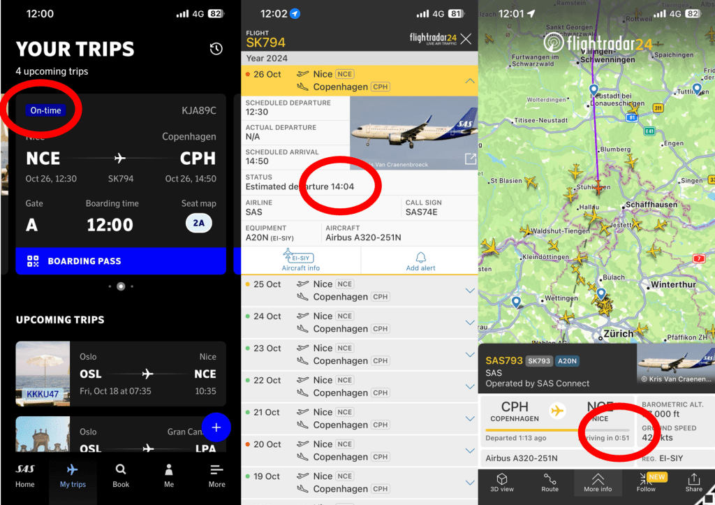 Sitter på flyplassen i Nice, klokken er 1200, og det burde være tid for boarding, siden flyet skal gå 1230. SAS-appen viser at flyet er «on time», men gate har ikke kommet opp ennå – så jeg sjekker Flightradar og finner ut at flyet er estimert til å ta av kl. 1404. Et raskt søk på selve flyet, og man kan konstatere at maskinen nærmer seg Zürich, og skal lande om 40 minutter.