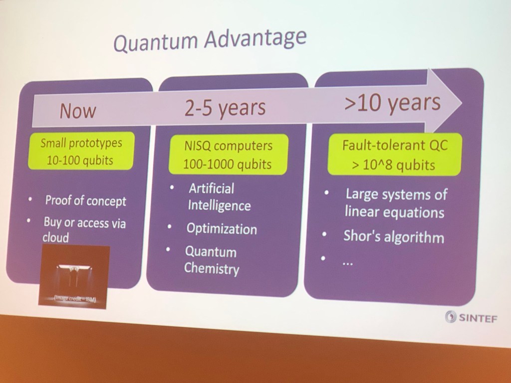 Kommentar: Kan man bruke en QC til å finne heuristikk som så kan gjøres om til en algoritme som kan brukes av en vanlig datamaskin? Første anvendelse antakelig maskinlæring ved hjelp av quantum annealing, kanskje innen ti år. Ennå ingen problemer der man har quantum supremacy, noe uklart om vi har det ennå, men det kan kanskje komme for et eller annet problem snart.