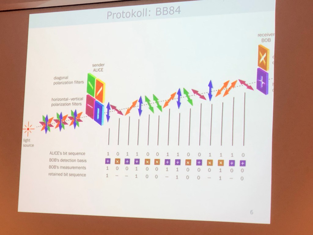 Dette er sikkert pga to prinsipper: Ikke mulig å klone kvanteinformasjon. Måling vil forstyrre kommunikasjonen. I praksis: nokså enkelt å hacke kvantekommunikasjon. Kvantehacking, russer (Vadim Makarov) med postdoc på UiO, laget en koffert som kunne gjøre dette.
