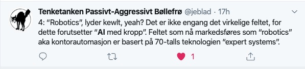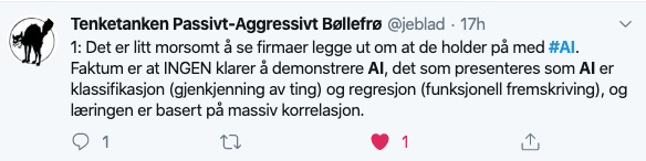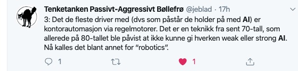 Tenketanken Passivt-Agressivt Bøllefrø (@jeblad) er verdt å følge på Twitter. I går kom han med denne stripen med, tja, poengterte utsagn om den pågående AI-hypen: