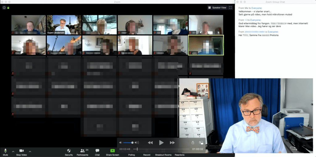 Som synes var det endel deltakere som ikke slo på videokameraet, delvis fordi de satt med dårlig forbindelse rundt omkring i verden. (Det var etpar deltakere som ikke klarte å komme seg på av tekniske årsaker, men jeg tok opp seminaret lokalt og sendte ut en redigert versjon etterpå.)