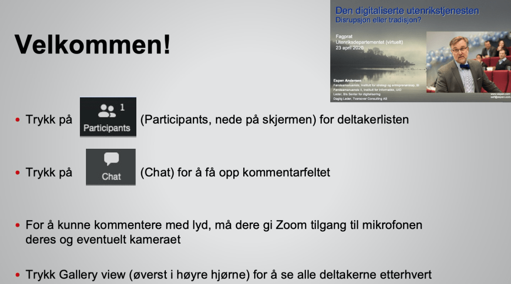 Jeg valgte å kjøre et svært strukturert opplegg gjennom møtet. Møtet varte i 90 minutter med ca. 30 deltakere over Zoom (Utenrikstjenesten kan ikke selv kjøre Zoom, men kan delta på møter med produktet, så vi kjørte på min lisens). Jeg førsøkte å kjøre mesteparten i Gallery View, og ba deltakerne om det samme ved å ha et skjermbilde med noen instruksjoner ved oppstart.