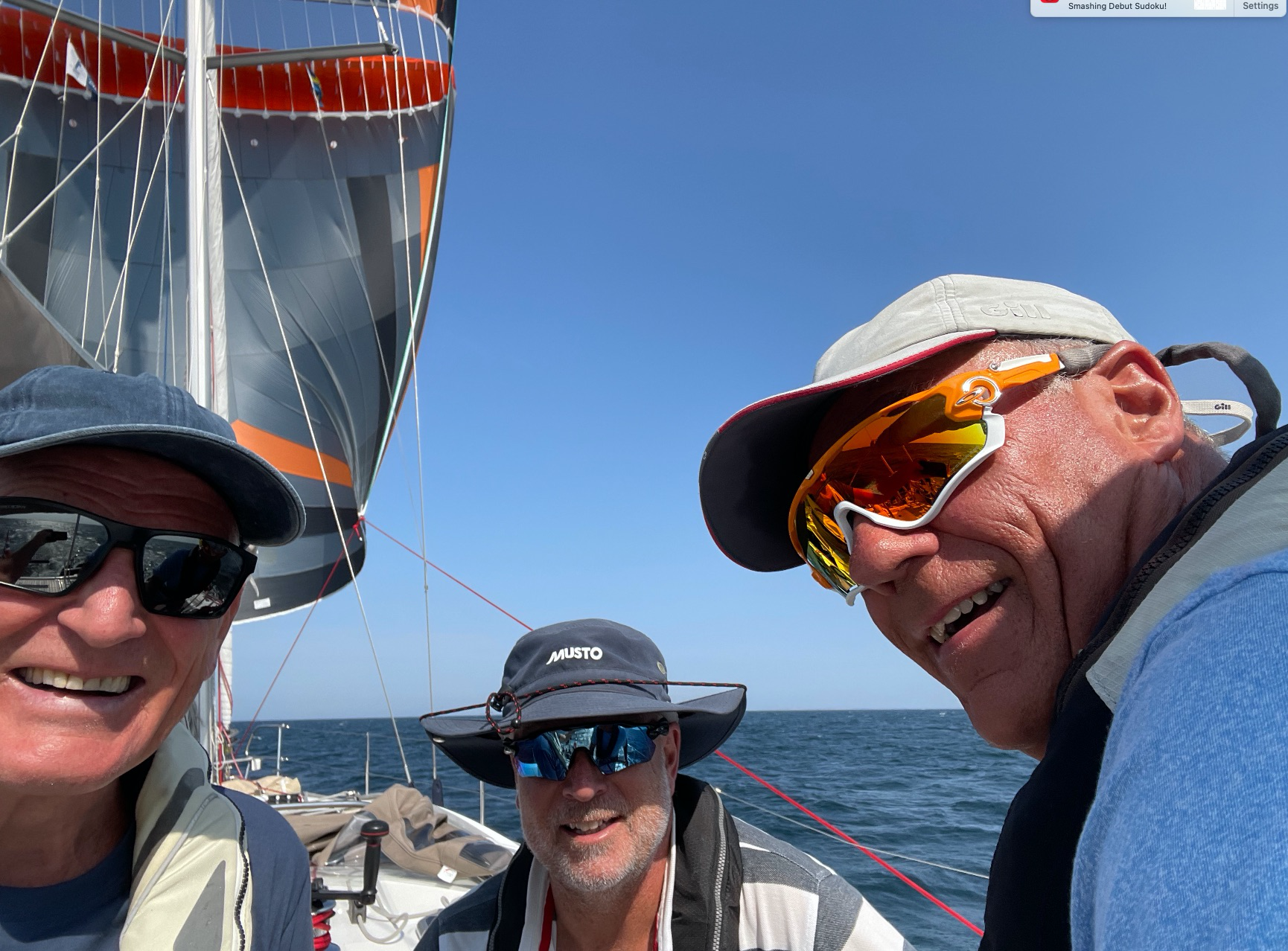 I mer hjemlige farvann har turen gått fra Marstrand-Mollösund-Käringön-Havstenssund-Koster-Strømstad med stort sett fine forhold og tradisjonell standard på det kulinariske (sjøkreps nesten hver dag). Det har vært hyggelig å kunne bidra litt selv – min nye tittel (tidligere tungmatros) er nå omelettmatros. Men det som virkelig gjorde denne turen minneverdig var seilingen mellom Käringön og Havsstensund, der vi satte parasail, hadde 10-14 sekundmeter rett over låringen, og seilte 40 nautiske mil på 4,5 timer (i tillegg mistet vi en fender, bestemte oss for å behandle det som en mann-over-bord øvelse, så vi måtte ta ned seilet og snu). Maks hastighet på båten var 11.8 knop, noe som er nokså utrolig for en komfortabel 43 fots cruiser (Beneteau Oceanis 43, med navn Gone Walkabout.)