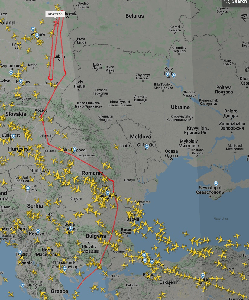 En Global Hawk er et ubemannet overvåkningsfly som bruker radar og infrarøde kameraer for å overvåke hva som skjer. Dette flyet (eller, vel, dronen), med kallesignal Forte10, flyr langs grensen til Ukraina. I følge Wikipedia har disse også fløyet over Ukraina og er vel en av grunnene til at vi vet relativt mye om russisk fremrykking i landet.