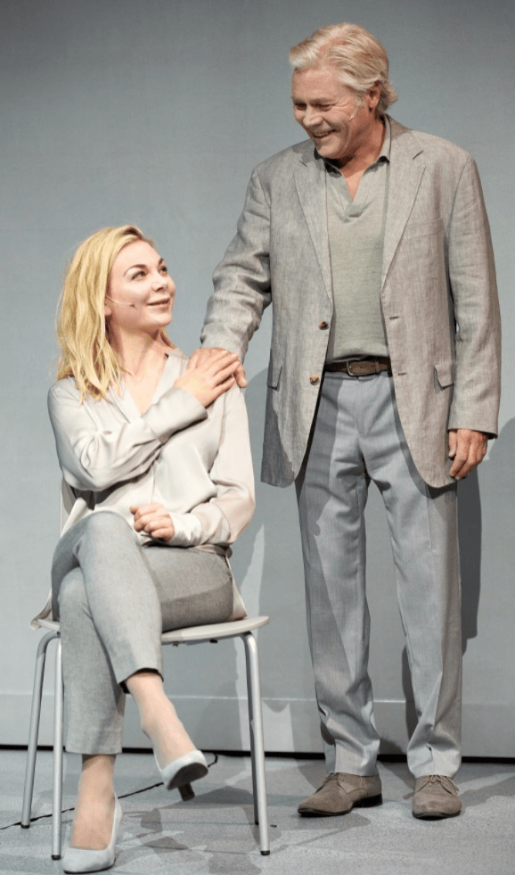 Det å ha et lite ensemble i et stykke på over to timer gjør at man blir kjent med skuespillerne, og gir dem mulighet til å spille på et større register. Mostraum og Nordrum er de samme gjennom det hele, men de tre andre spiller mange ulike roller, noe særlig Marte Ingebrigtsen får til som tenåring, dement eldre mor, og vestkantfruer i ulike varianter. Samtlige er rutinerte og opplagte og viser spilleglede – men så er jo dette også høstens publikumssuksess, noe som får skuldrene til å senkes på scene og i sal. Scenografien er abstrakt og svært effektiv – spesielt bruken av Facebookmeldinger og en festlig selvfilmet video fra Bjørns hus i Fredrikstad gir anledning til gjenkjennende gapskratt. Nokså monumentale kulisser fremhever det litt kammeraktige stykket uten å dominere.