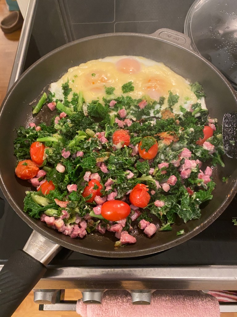 Sett lokk over, senk temperaturen litt til, og stek til tomatene er myke, grønnkålen har krympet og eggene er slik du vil ha dem. Rør litt om av og til i grønnsakene – grønnkål svir seg lett.