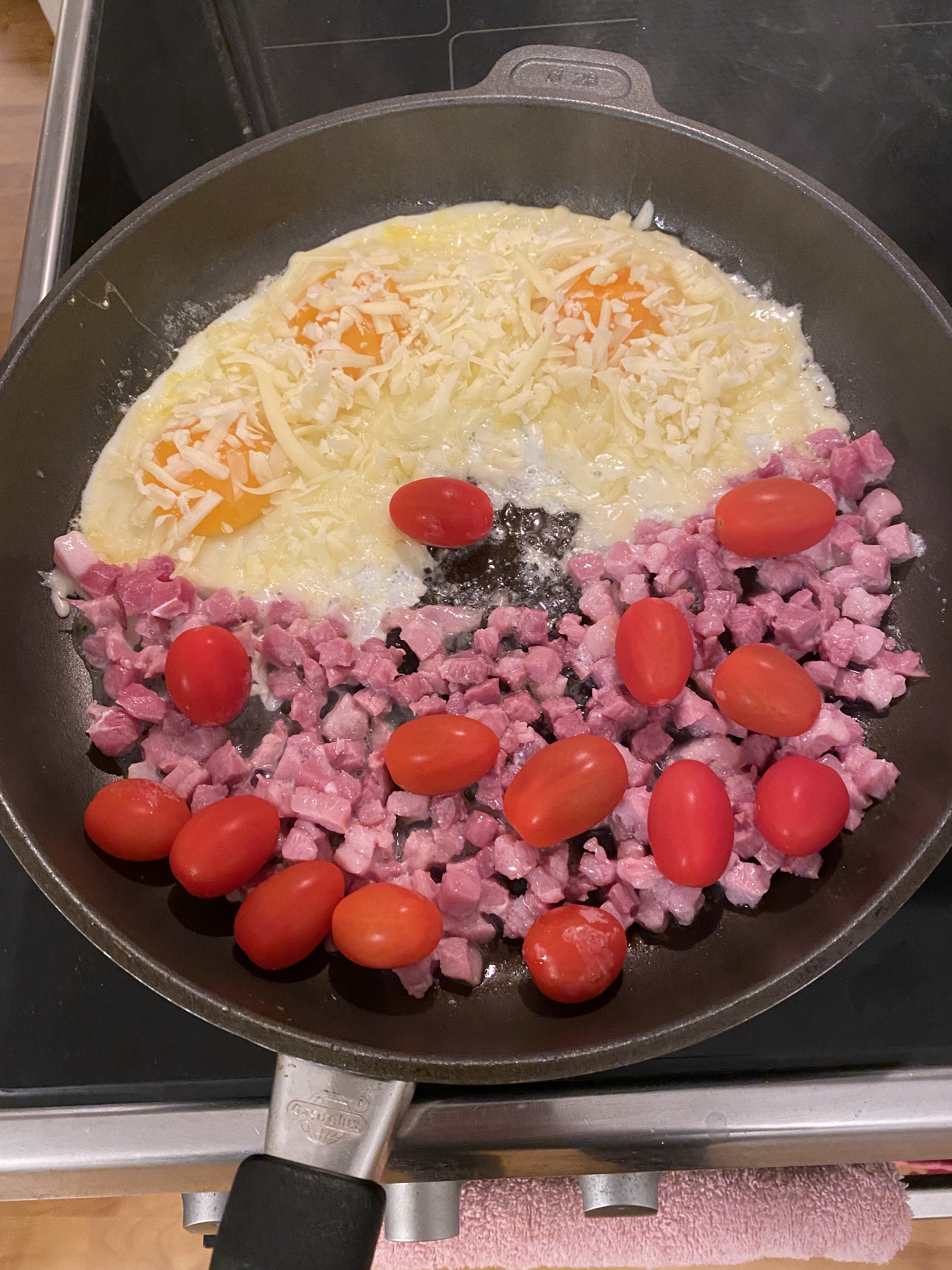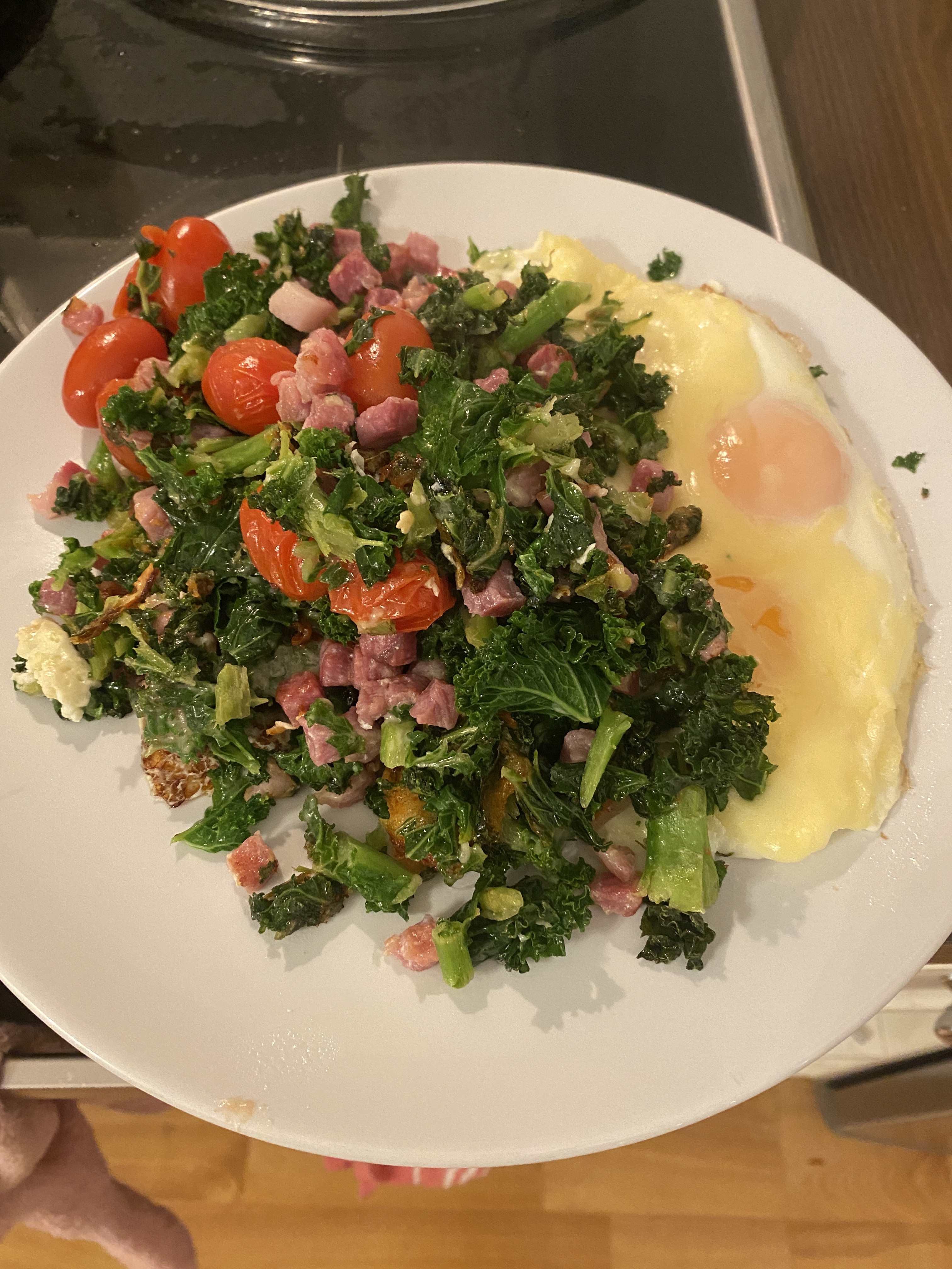 Strø revet ost over eggene (og for all del, gjerne over baconet også.) Ta i en neve cherrytomater og halvparten av en pose revet grønnkål. (Det ser litt voldsomt ut med alle den grønnkålen, men den krymper til nesten ingenting.)