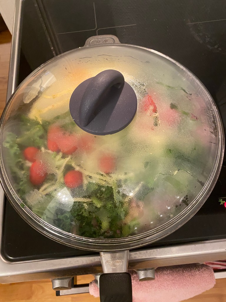 Forøvrig er grønnkål og småtomater suverent tilbehør til kjøtt, fisk, alt mulig, og jeg har det alltid liggende i kjøleskapet, klart til bruk (med mindre jeg har litt ratatouille tilgjengelig, da foretrekker jeg det.) I følge min ernæringsdyktige datter Helene er grønnkål stappfullt av antioksydanter og andre gode ting, og småtomater (som en tysk bekjent kaller «Tomatenküsse») smaker fantastisk når de er varmet litt.